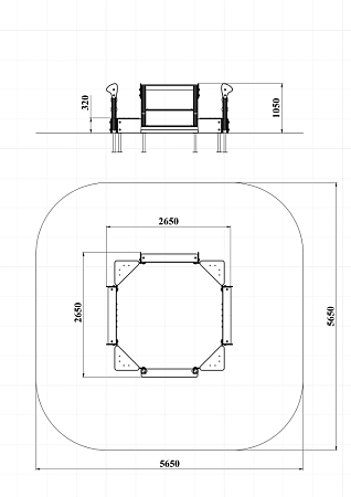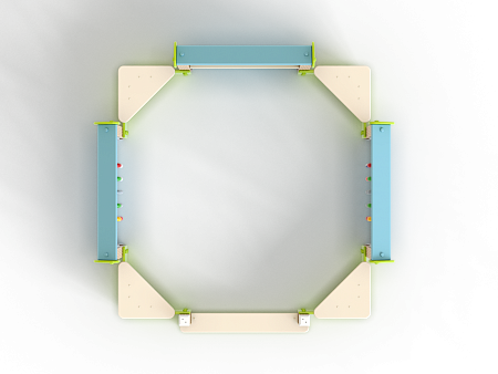 Песочница состоит из столбов с прикрепленными к ним по периметру фанерными ограждениями. Между боковыми столбами расположены два комплекта счет с разноцветными пластиковыми бубликами. На столбах установлены три спойлера, один расположен напротив входа, два других на столбах со счетами.