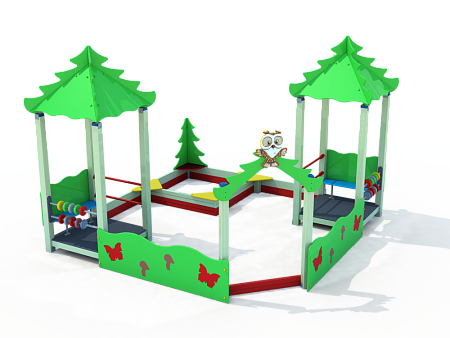 Песочный дворик - модульная конструкция из игровых и развивающих элементов с лесной тематикой. Конструкция оборудована двумя башнями - беседками, одной аркой, песочницей и ограждением по периметру из деревянного бруса и фанеры с художественным оформлением. Башни оборудованы крышей, фанерными ограждениями, металлическими перекладинами и детскими счетами с пластиковыми бубликами. Арка выполнена из фанеры в форме ёлки с декоративным соединяющим элементом в форме совы с художественным оформлением. Песочница с четырьмя фанерными накладками и декоративным фанерным ограждением в наружном углу в форме ёлки.