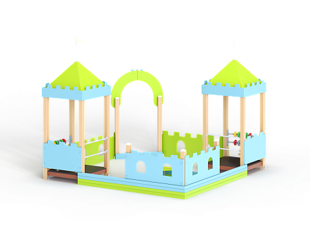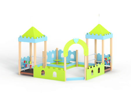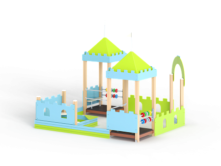 Песочный дворик – модульная конструкция из игровых и развивающих элементов с кремлевской тематикой. Конструкция оборудована двумя башнями беседками, одной аркой, песочницей, ограждением по периметру из деревянного бруса и фанеры. Башни беседки оборудованы крышами, металлическими перекладинами, фанерными ограждениями, детскими счетами с пластиковыми бубликами и сидениями. Песочница с четырьмя фанерными накладками и декоративным фанерным ограждением в наружном углу в форме стен кремля.