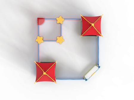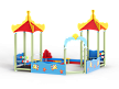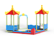 Песочный дворик - модульная конструкция из игровых и развивающих элементов с морской тематикой. Конструкция оборудована двумя башнями - беседками, одной аркой, песочницей и ограждением по периметру из деревянного бруса и фанеры с художественным оформлением. Башни оборудованы крышей, фанерным ограждением и детскими счетами с пластиковыми бубликами. Арка выполнена из фанеры в форме дельфинов с декоративным соединяющим элементом в форме мяча. Песочница с четырьмя фанерными накладками и декоративным фанерным ограждением в наружном углу в форме коралла.
