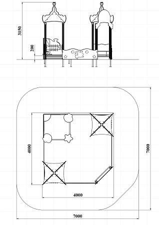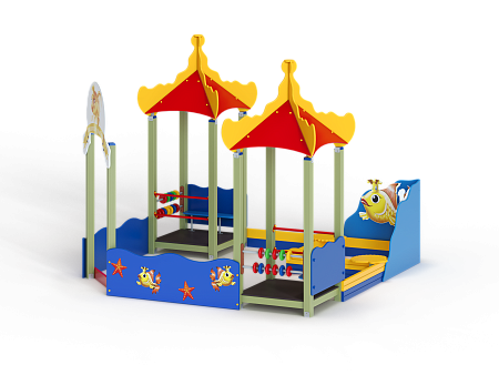 Песочный дворик - модульная конструкция из игровых и развивающих элементов с морской тематикой. Конструкция оборудована двумя башнями - беседками, одной аркой, песочницей и ограждением по периметру из деревянного бруса и фанеры с художественным оформлением. Башни оборудованы крышей, фанерными ограждениями и детскими счетами с пластиковыми бубликами. Арка выполнена из фанеры в форме золотой рыбки с художественным оформлением. Песочница с четырьмя фанерными накладками и декоративным фанерным ограждением в наружном углу в форме морской волны с художественным оформлением в виде золотых рыбок.