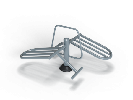 Тренажер рассчитан на тренировку двух пользователей. Пользователь в сидячем положении, цепляясь ногами за подножки, поднимает и опускает корпус нагружая мышцы спины и пресса.