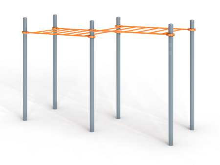 Воркаут состоит из шести несущих столбов и двух рукоходов с зажимными хомутами.