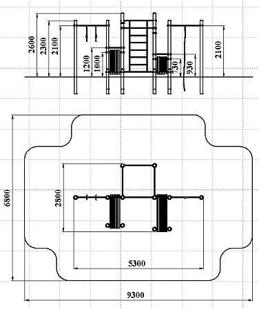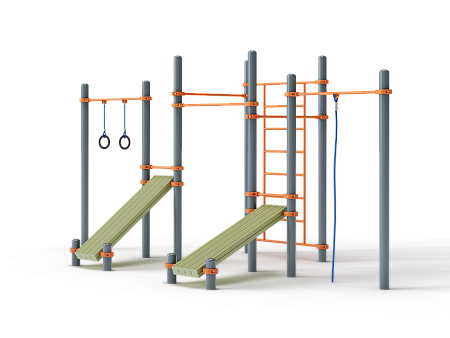 Воркаут состоит из двенадцати несущих столбов, девяти перекладин, перекладины с канатом, перекладины с гимнастическими кольцами, шведской стенки и двух наклонных скамей из бруса с зажимными хомутами.