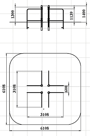 Воркаут состоит из четырех несущих столбов и восьми брусьев с зажимными хомутами.