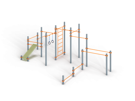 Воркаут состоит из семнадцати несущих столбов, четырнадцати перекладин, перекладины с гимнастическими кольцами, шведской стенки и наклонной скамьи из бруса с зажимными хомутами.