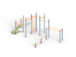Воркаут состоит из семнадцати несущих столбов, четырнадцати перекладин, перекладины с гимнастическими кольцами, шведской стенки и наклонной скамьи из бруса с зажимными хомутами.