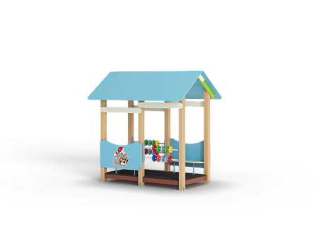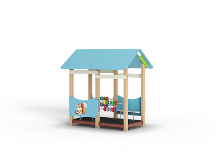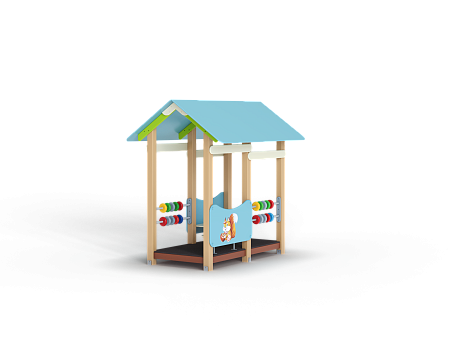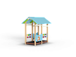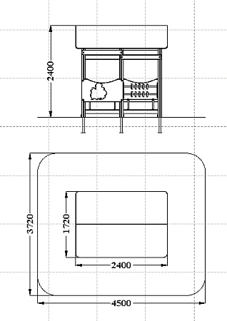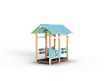 Беседка состоит из башни с крышей, ограждений с художественно оформленной поверхностью, скамеек, двух комплектов детских счет с пластиковыми бубликами.