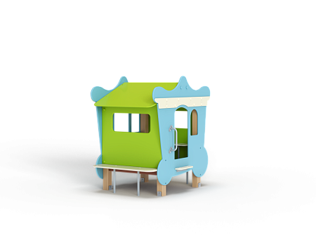 Домик стилизован в виде кареты, состоит из башни с крышей, ступенек, ограждений в виде деталей кареты, скамеек.