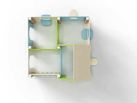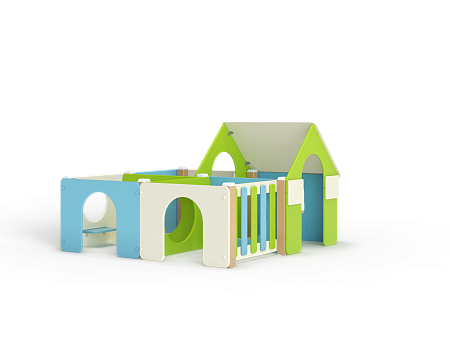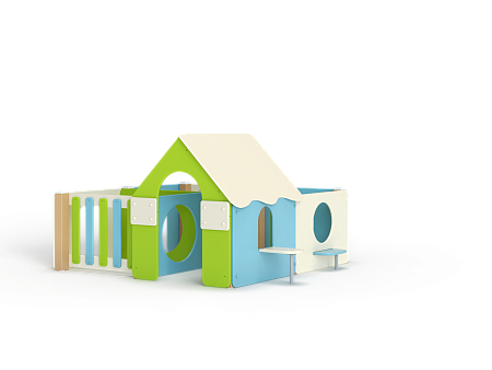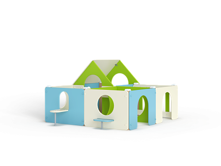 Лабиринт состоит из четырех секций (одна из них с крышей) разделенных фанерными ограждениями с круглыми и арочными лазама. Со стороны улицы крепятся столики и ступеньки.