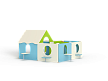 Лабиринт состоит из четырех секций (одна из них с крышей) разделенных фанерными ограждениями с круглыми и арочными лазама. Со стороны улицы крепятся столики и ступеньки.