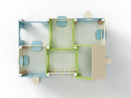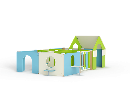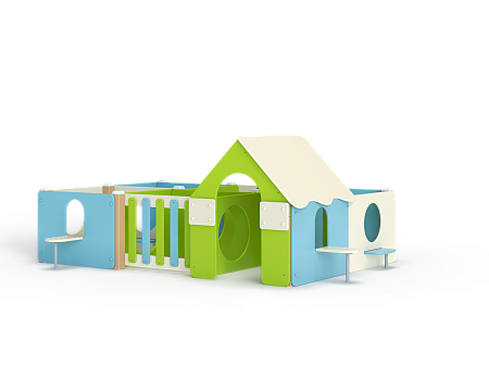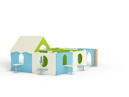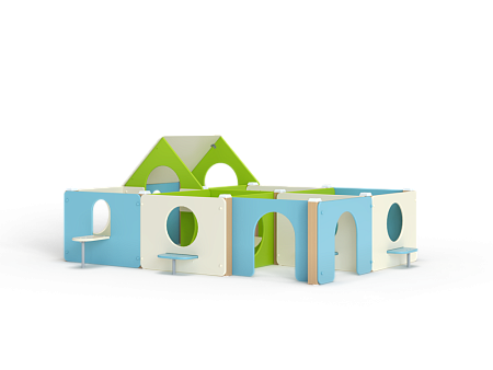 Лабиринт состоит из шести секций (одна из них с крышей) разделенных фанерными ограждениями с круглыми и арочными лазама. Со стороны улицы крепятся столики и ступеньки.