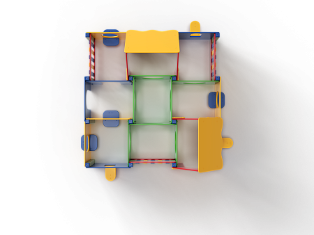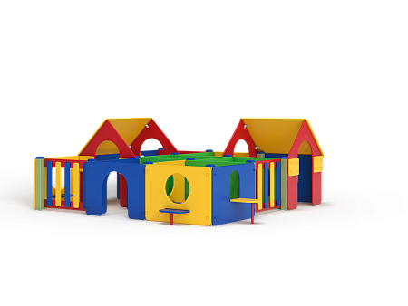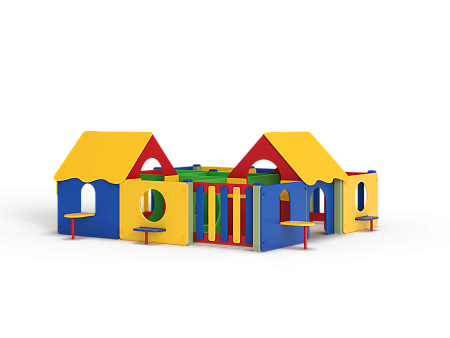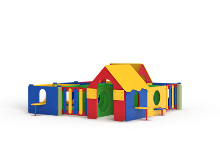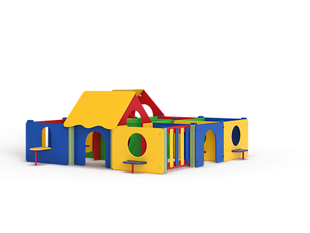 Лабиринт состоит из девяти секций (две из них с крышами) разделенных фанерными ограждениями с круглыми и арочными лазама. Со стороны улицы крепятся столики и ступеньки.