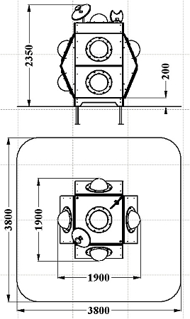 Домик состоит из башни с объёмными геометрическими ограждениями, на которых расположены пластиковые иллюминаторы и один вход. Крыша домика имеет один пластиковый иллюминатор и два декоративных элемента в виде антенны и радара. Внутри домика расположена скамейка и комплект детских счет.