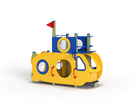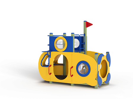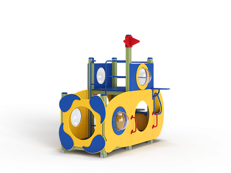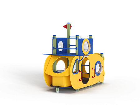 Домик скомпонован в форме подводной лодки, состоит из двух спаренных башен и одной радиусной полубашни, являющейся передом подводной лодки. Центральная башня - двухъярусная, имитирует рубку подводной лодки. Ограждениями первого яруса являются фанерные листы с вырезами-лазами. На задней части первого яруса два ограждения с пластиковыми иллюминаторами. Переход с первого яруса на второй обеспечен лестницей металлической, крепящейся снизу к полу первого яруса, сверху крепится к столбам башни. Второй ярус огражден фанерными ограждениями с пластиковыми иллюминаторами и дуговыми металлическими перекладинами.