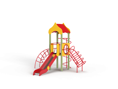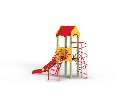 Детский игровой комплекс состоит из башни с крышей, горкой, спиралью наклонной, ограждения с лазом, лианы наклонной, шестом спиралью, перекладинами и ручек вспомогательных.