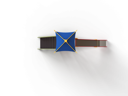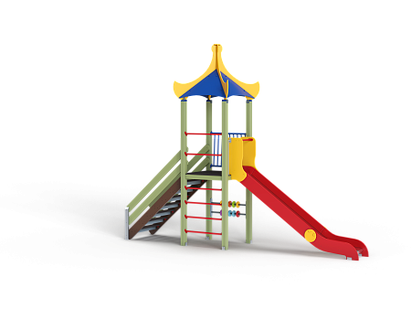 Детский игровой комплекс состоит из одной башни с крышей, лестницей, горкой, перекладинами, ограждением и детскими счётами.