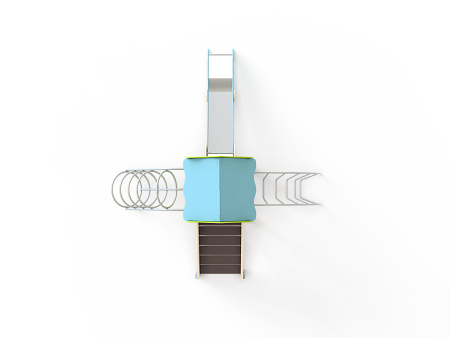 Детский игровой комплекс состоит из одной башни с крышей, лестницей, горкой, лианой и спиралью наклонной.