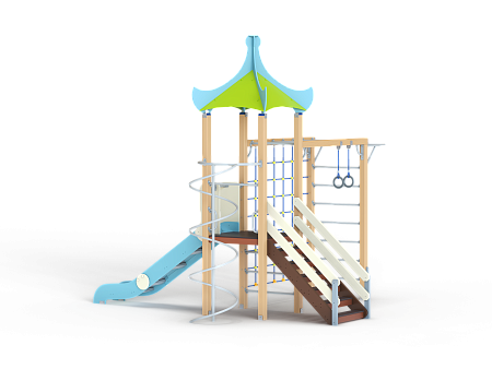 Детский игровой комплекс состоит из одной башни с продолжением в виде гимнастического комплекса. На башне установлена крыша, лестница, горка, шест-спираль, шведская стенка и ручки. Гимнастический комплекс состоит из рукохода, шведской стенки, турника, гимнастических колец и полипропиленовой сетки.