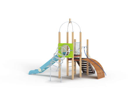 Детский игровой комплекс состоит из двух разновысоких башен. На одной из башен установлена металлическая крыша, спираль наклонная, горка, металлическое ограждение, на другой башне установлен трап барабан с перекладиной и канатом, шведская стенка, ручки и лестница.