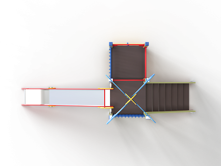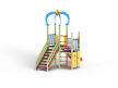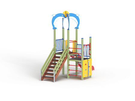 Детский игровой комплекс состоит из двух разновысоких башен. На одной из башен установлены крыша в форме дельфинов, лестница, горка, металлическое ограждение, на другой башне установлены альпинистская стенка, перекладина с канатом, металлическое ограждение, ручки и шведская стенка.