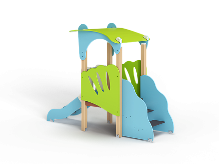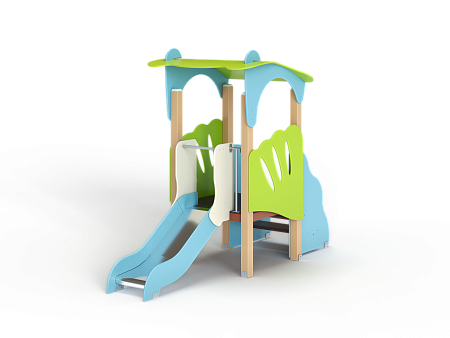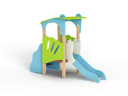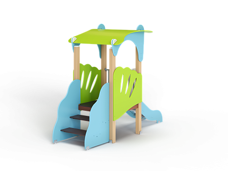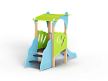 Детский игровой комплекс состоит из одной башни с горкой, фасонными фанерными крышей, лестницей и ограждениями.