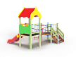 Детский игровой комплекс состоит из двух башен соединенных разновысоким мостом с металлическими перилами. На первой башне установлена крыша, фанерное ограждение, ограждение из бруса с перекладинами и горка. На второй башне установлена лестница, ограждение из бруса с перекладинами и лиана наклонная с перекладиной.