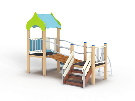 Детский игровой комплекс состоит из двух башен соединенных разновысоким мостом с металлическими перилами. На первой башне установлена крыша, фанерное ограждение, ограждение из бруса с перекладинами и горка. На второй башне установлена лестница, ограждение из бруса с перекладинами и лиана наклонная с перекладиной.