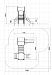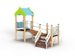 Детский игровой комплекс состоит из двух башен соединенных разновысоким мостом с металлическими перилами. На первой башне установлена крыша, фанерное ограждение, ограждение из бруса с перекладинами и горка. На второй башне установлена лестница, ограждение из бруса с перекладинами и лиана наклонная с перекладиной.