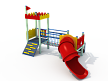 Детский игровой комплекс состоит из двух башен соединенных радиусным мостом с металлическими перилами. На первой башне установлена крыша,фанерное ограждение, ограждение из бруса с перекладинами и лестница. На второй башне установлена горка, фанерное ограждение и ограждение из бруса с перекладинами.