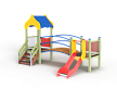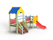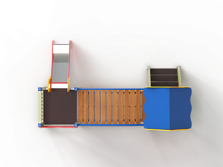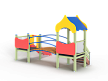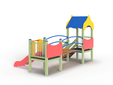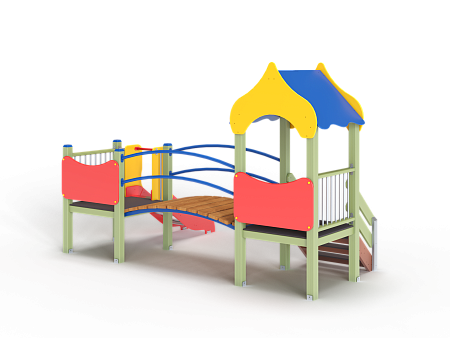 Детский игровой комплекс состоит из двух башен соединенных радиусным мостом с металлическими перилами. На первой башне установлена крыша,фанерное ограждение, ограждение из бруса с перекладинами и лестница. На второй башне установлена горка, фанерное ограждение и ограждение из бруса с перекладинами.