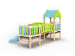 Детский игровой комплекс состоит из двух башен соединенных радиусным мостом с фанерными перилами. На первой башне установлена крыша, два фанерных ограждения из балясин и лестница. На второй башне установлена горка и два ограждения фанерных из балясин.