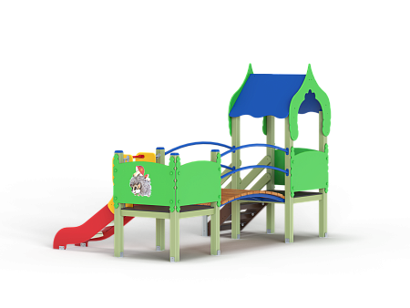 Детский игровой комплекс состоит из двух башен соединенных радиусным мостом с металлическими перилами. На первой башне установлена крыша, два фанерных ограждения с художественно оформленной поверхностью и лестница. На второй башне установлена горка и два ограждения фанерных с художественно оформленной поверхностью.