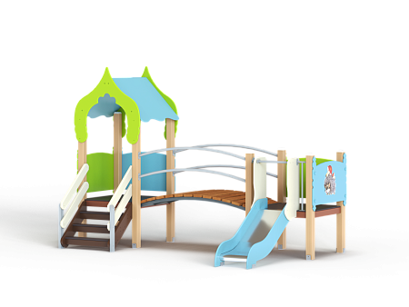 Детский игровой комплекс состоит из двух башен соединенных радиусным мостом с металлическими перилами. На первой башне установлена крыша, два фанерных ограждения с художественно оформленной поверхностью и лестница. На второй башне установлена горка и два ограждения фанерных с художественно оформленной поверхностью.