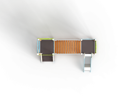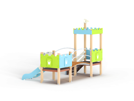 Детский игровой комплекс состоит из двух башен соединенных радиусным мостом с металлическими перилами. На первой башне установлена крыша, декоративные флажки, два фанерных ограждения и лестница. На второй башне установлена горка и два ограждения фанерных.