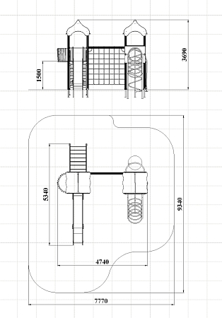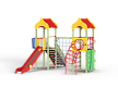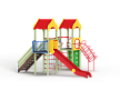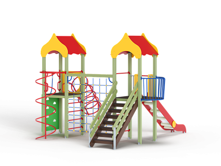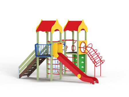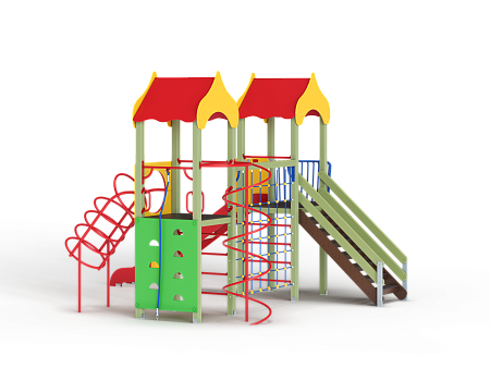 Детский игровой комплекс состоит из двух башен крышами. На одной из башен установлена лестница, горка, балкон, шведская стенка. На другой башне установлены альпинистская стенка, перекладина с канатом, шест спираль, шведская стенка, фанерное ограждение и ручки вспомогательные. Башни соединены полипропиленовой сеткой и столбом. Все резьбовые соединения должны быть закрыты разноцветными пластиковыми заглушками.