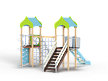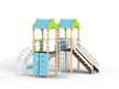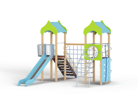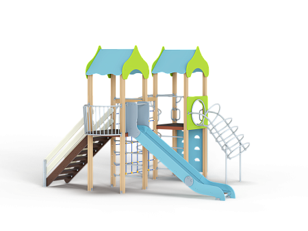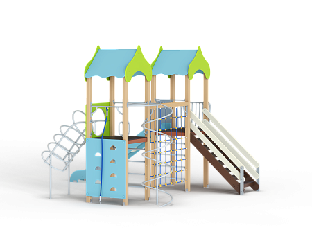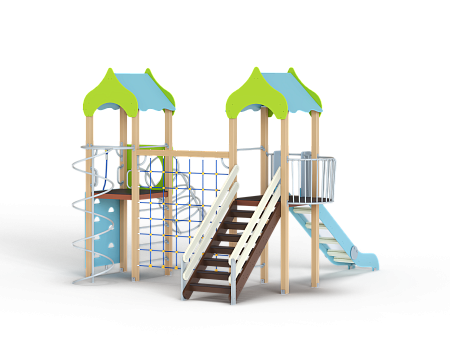 Детский игровой комплекс состоит из двух башен крышами. На одной из башен установлена лестница, горка, балкон, шведская стенка. На другой башне установлены альпинистская стенка, перекладина с канатом, шест спираль, шведская стенка, фанерное ограждение и ручки вспомогательные. Башни соединены полипропиленовой сеткой и столбом. Все резьбовые соединения должны быть закрыты разноцветными пластиковыми заглушками.
