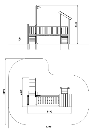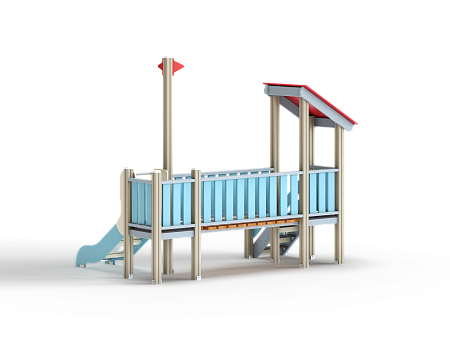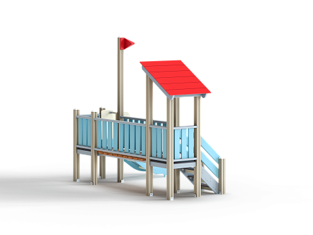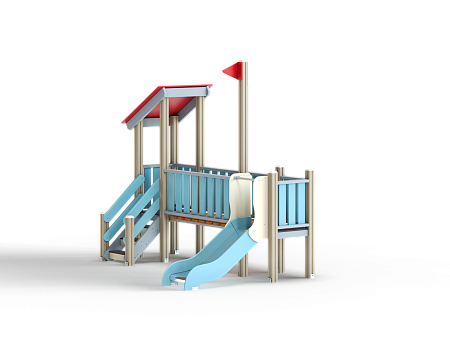 Детский игровой комплекс состоит из двух башен соединенных прямым мостом с перилами, выполненными из бруса. На первой башне установлены лестница, крыша и два ограждения из бруса. На второй башне установлены горка, декоративные флажки и два ограждения из бруса.
