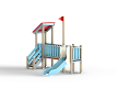 Детский игровой комплекс состоит из двух башен соединенных прямым мостом с перилами, выполненными из бруса. На первой башне установлены лестница, крыша и два ограждения из бруса. На второй башне установлены горка, декоративные флажки и два ограждения из бруса.