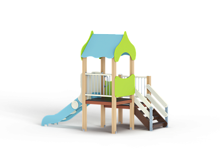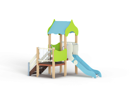 Детский игровой комплекс состоит из двух разновысоких башен. На одной башне установлены фанерная крыша, горка, вспомогательные ручки, фанерное ограждение и ограждение из бруса с перекладинами. На второй башне установлена лестница, фанерное ограждение и ограждение из бруса с перекладинами.