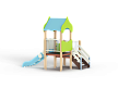 Детский игровой комплекс состоит из двух разновысоких башен. На одной башне установлены фанерная крыша, горка, вспомогательные ручки, фанерное ограждение и ограждение из бруса с перекладинами. На второй башне установлена лестница, фанерное ограждение и ограждение из бруса с перекладинами.