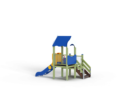 Детский игровой комплекс стилизован в цветах ДПС, состоит из двух разновысоких башен. На одной башне установлены фанерная крыша, горка, вспомогательные ручки, фанерное ограждение и ограждение из бруса с перекладинами. На второй башне установлены лестница, фанерное ограждение и ограждение из бруса с перекладинами.