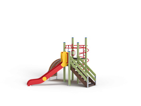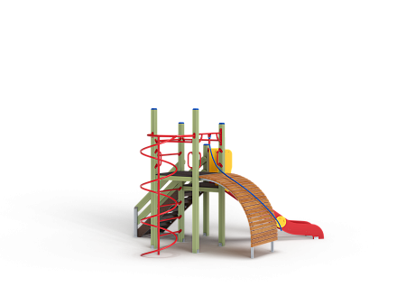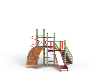 Детский игровой комплекс состоит из двух разновысоких башен. На одной из башен установлена лестница, горка, металлическое ограждение, на другой башне установлены трап барабан с перекладиной и канатом, шест спираль, две шведские стенки и ручки вспомогательные.