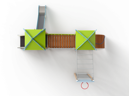 Детский игровой комплекс состоит из двух башен с крышами. На первой башне установлена лестни-ца, горка и фанерное ограждение. На второй башне установлены трап барабан с перекладиной и канатом и фанерное ограждение. Башни соеди-нены между собой разновысоким мостом, с одной стороны которого установлено фанерное огражде-ние, а с другой стороны сетка металлическая. Вто-рая башня имеет продолжение в виде вынесенной шведской стенки с баскетбольным щитом, соеди-няются металлическим рукоходом