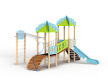 Детский игровой комплекс состоит из двух башен с крышами. На первой башне установлена лестни-ца, горка и фанерное ограждение. На второй башне установлены трап барабан с перекладиной и канатом и фанерное ограждение. Башни соеди-нены между собой разновысоким мостом, с одной стороны которого установлено фанерное огражде-ние, а с другой стороны сетка металлическая. Вто-рая башня имеет продолжение в виде вынесенной шведской стенки с баскетбольным щитом, соеди-няются металлическим рукоходом