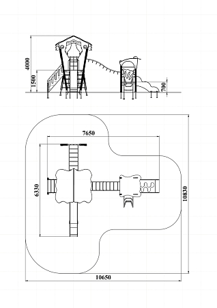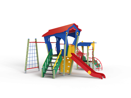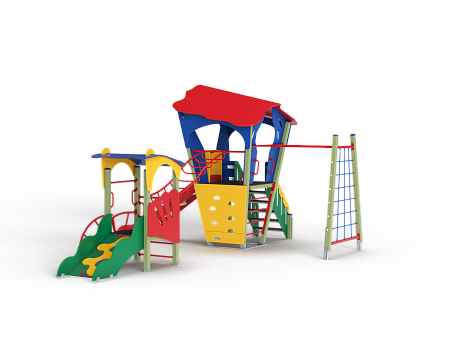 Детский игровой комплекс состоит из двух башен. На одной из башен установлена лестница, горка, альпинистская стенка, ограждение, ручки вспомогательные и внешняя сетка полипропиленовая, соединенная с башней рукоходом. На другой башне установлены трап, лиана, шведская стенка, ручки вспомогательные и ограждение. Башни соединены между собой металлическим рукоходом.