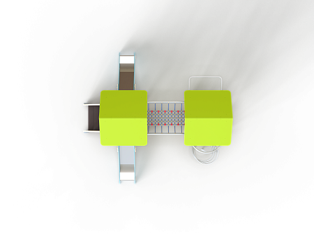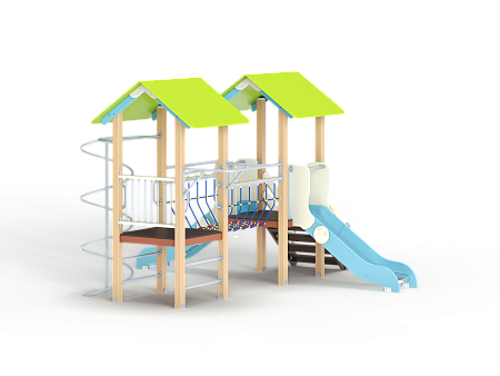Детский игровой комплекс состоит из двух башен. На одной из башен установлена лестница, две горки и крыша, на другой башне установлены турник, шест спираль, шведская стенка, ручки вспомогательные и ограждение из бруса с перекладинами Башни соединены между собой канатным мостом.