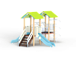 Детский игровой комплекс состоит из двух башен. На одной из башен установлена лестница, две горки и крыша, на другой башне установлены турник, шест спираль, шведская стенка, ручки вспомогательные и ограждение из бруса с перекладинами Башни соединены между собой канатным мостом.