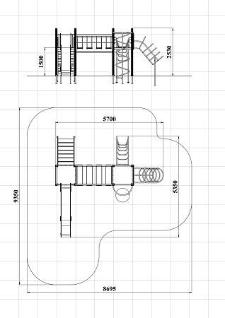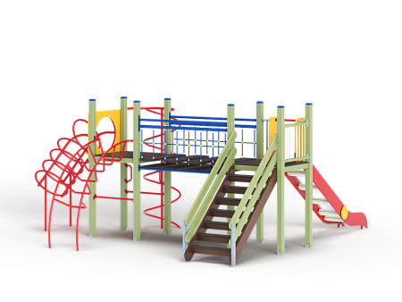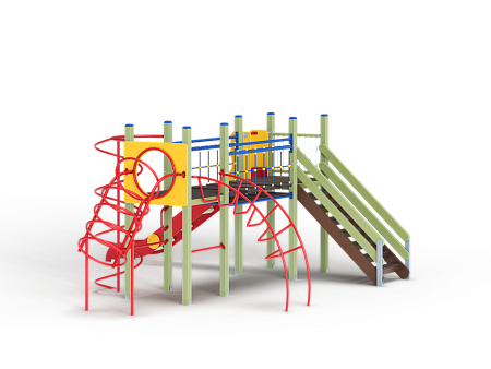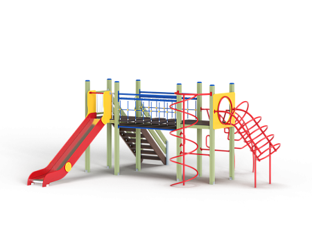 Детский игровой комплекс состоит из двух башен. На первой башне установлена лестница, горка и ограждение из бруса с перекладинами. Первая башня соединяется со второй башней подвесным мостом. На второй башне установлено ограждение с круглым вырезом, спираль наклонная, лиана и шест-спираль.