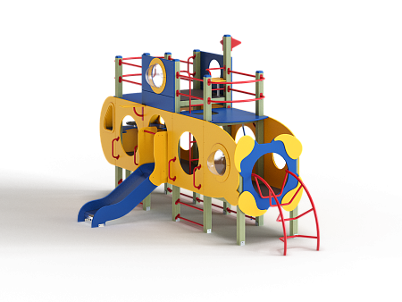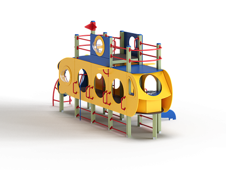 Детский игровой комплекс скомпонован в форме подводной лодки, состоит из четырех спаренных башен и одной радиусной полубашни, являющейся передом подводной лодки. Центральная башня - двухъярусная, имитирует рубку подводной лодки. Ограждениями первого яруса являются фанерные листы с круглыми вырезами-лазами. На задней части первого яруса два ограждения с пластиковыми иллюминаторами. На первом ярусе центральной башни расположена горка, напротив неё - ограждение с лазом и перекладина с канатом. Входами на первый ярус со стороны улицы являются шведские стенки, расположенные под боковыми ограждениями с лазами. К задней части подводной лодки крепится лиана наклонная. Переход с первого яруса на второй обеспечен лестницей металлической, крепящейся снизу к полу первого яруса, проходящей сквозь люк-вырез пола второго яруса, сверху крепится к столбам башни. Второй ярус огражден фанерными ограждениями с пластиковыми иллюминаторами и дуговыми металлическими перекладинами.